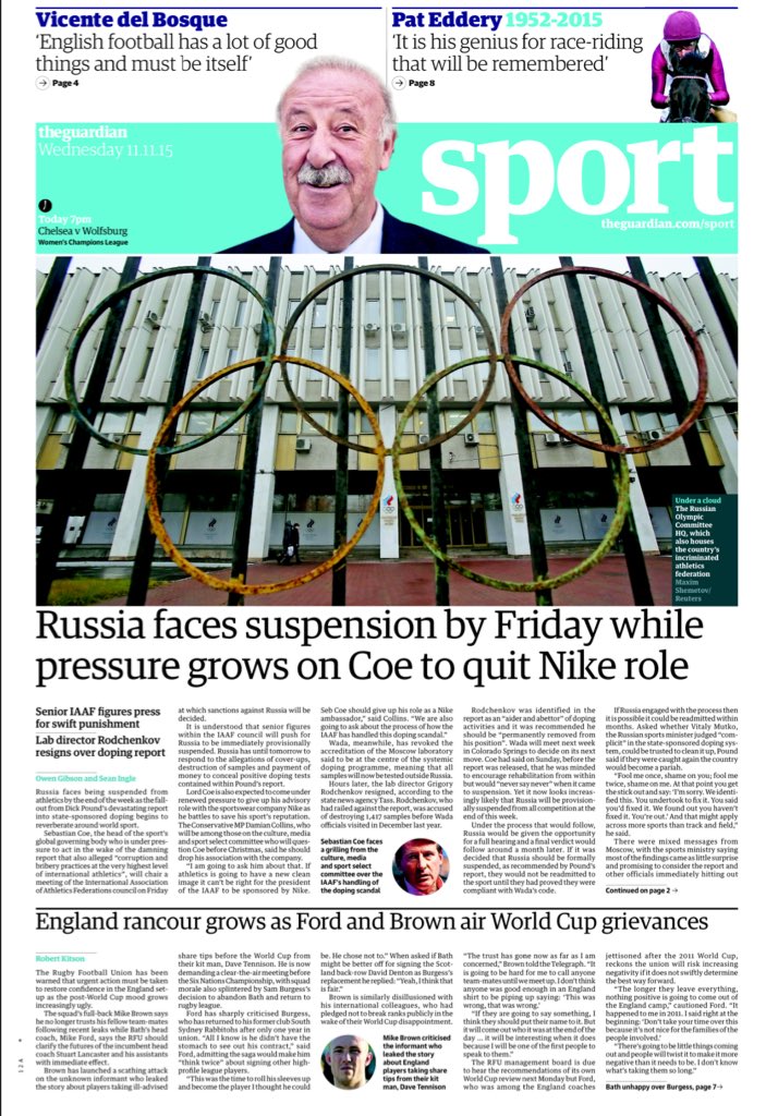 The Guardian låter i dessa tider av dopningsavslöjanden Wenger-citat från L’Equipe häromdagen ta plats. ”Arsenal har ’spelat mot många lag’ som var dopade”, påstår fransmannen. Wenger anser att det finns stora dopningsproblem inom fotbollen och att allt för lite görs mot det. Tidningen har också en intervju med spanske förbudskaptenen Vicente Del Bosque under citatrubriken ”Det finns ingen ’engelsk’ fotboll längre, ingen egen stil”.