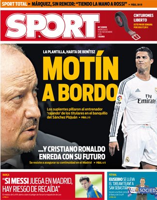 Sport ser till så att när Benìtez har en lugn dag från småhugg i Marca så blir det stora hugg norr ifrån i stället. ”Myteri”, hävdar tidningen om situationen i Real Madrid, och lägger till att ”spelarna har fått nog av Benítez”. Man hänvisar till El Confidencial i går, som studerat hur spelarna på bänken inte var nöjda med en del kommentarer från tränaren under matchen mot Sevilla. Tidningen kopplar förstås också ihop att ”Cristiano Ronaldos framtid är trasslig”.