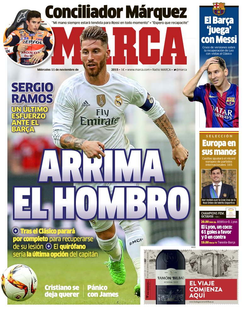 Marca tar sikte på El Clásico med Sergio Ramos och ”Ett sista försök innan Barça”, om att det finns hopp för den axelskadade mittbacken att bli spelklar. På temat spelare-på-väg-tillbaka-i-tid-till-El-Clásico skriver Marca bredvid att ”Barça ’chansar’ med Messi” .