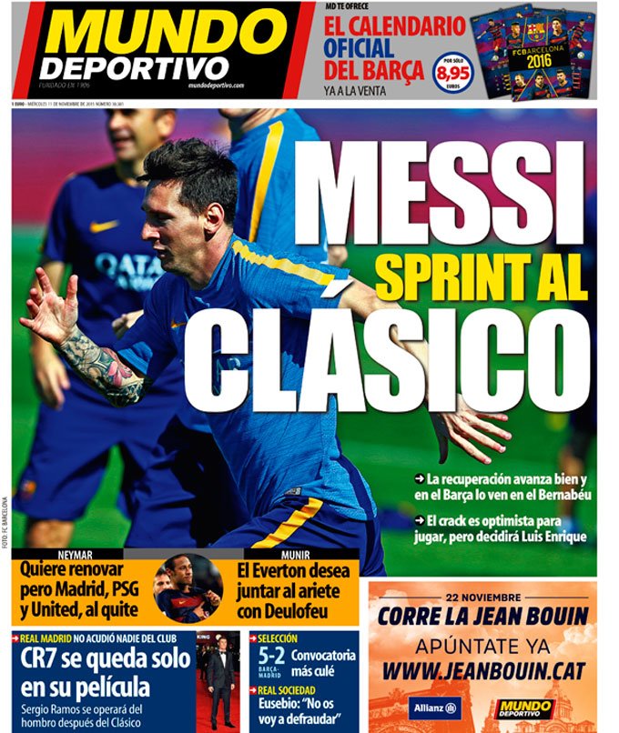 Mundo Deportivo skriver att ”Messi är i slutspurten till Clásico”, med tillägget att ”återhämtningen går bra och Barça ser honom som aktuell för Bernabéu” samt att ”stjärnan är optimistisk om att spela, men det är upp till Luis Enrique”. Det finns också utrymme för Silly Season. Om Neymar: ”Vill förlänga men Real Madrid, PSG och United vaksamma” och om Munir: ”Everton vill förena honom med Deulofeu”.