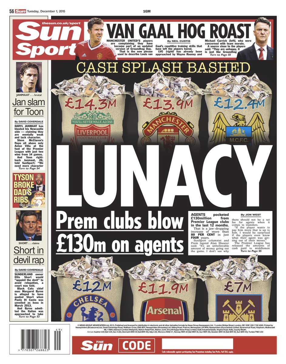 Daily Mirror lanserar idén att Chelsea vill ersätta Diego Costa med Bayern Münchens Thomas Müller under måttligt fyndiga rubriken ”Mauler out, Müller in” (mauler = ung. mörbultaren). Tidningen har också lyckats hitta ett citat från gamle holländske landslagsspelaren Willem Van Hanegem om landsmannen Louis Van Gaals Man United. Han är inte imponerad av det engelska laget. ”De får mig att gråta”.