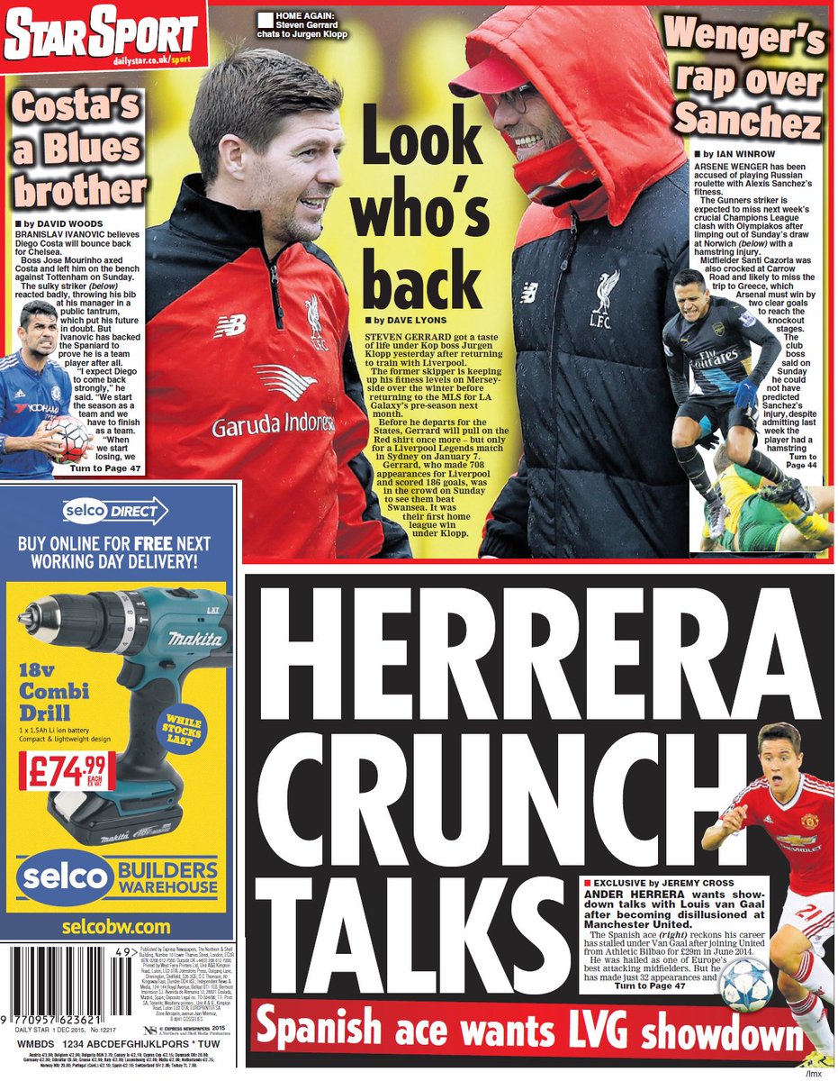 Daily Star hävdar att ”Herrera vill ha allvarligt samtal” med Van Gaal. Den spanske mittfältaren uppges desillusionerad och vill diskutera sin framtid med Unitedtränaren. Daily Star har liksom Mirror också bild på återvändaren Steven Gerrard tillsammans med Klopp på Liverpools träning.