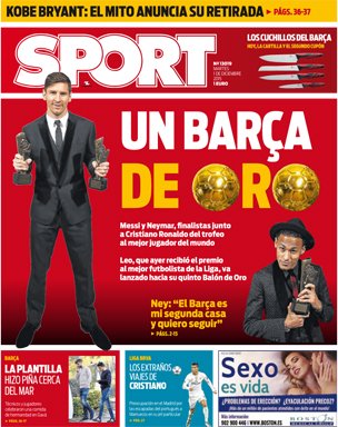 Sport nöjer sig som den regionaltidning man är med ”Barça av guld”, som täcker hela förstasidan tillsammans med två av de främsta pristagarna, Messi och Neymar. Som för att lägga en filt över de vilda transferryktena finns också citatet ”Neymar: Barça är mitt andra hem och här vill jag fortsätta”.