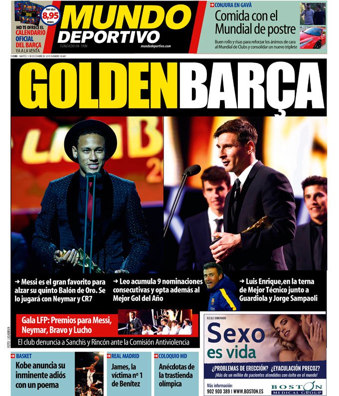 Mundo Deportivo använder av outgrundlig anledning engelskans ”Golden Barça”, och tar sedan upp både Ballon d’Or-nomineringarna och den spanska ligagalans priser.